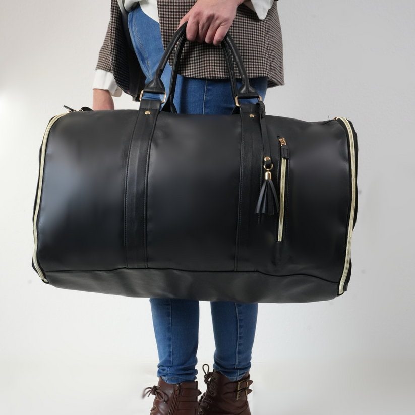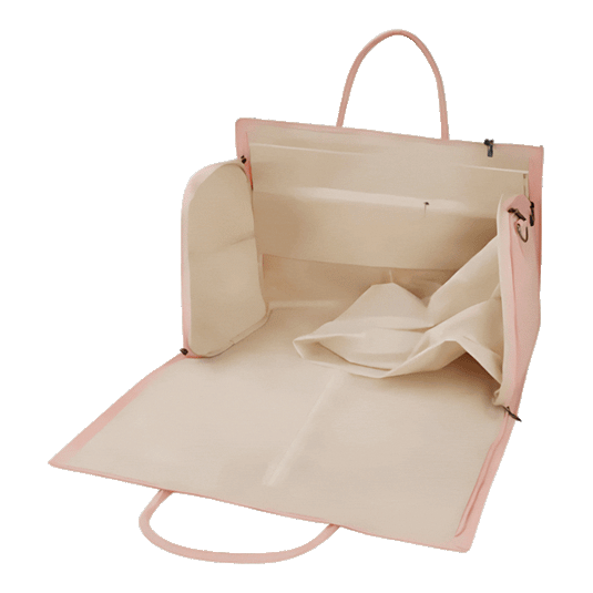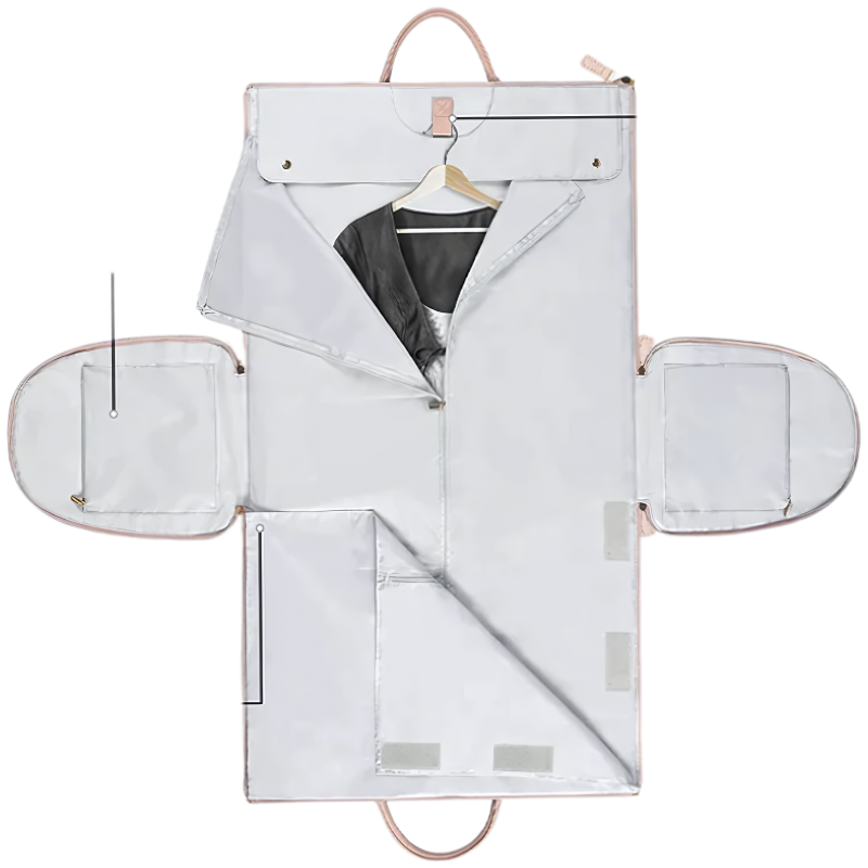 Tout rentre dans un seul sac. La housse intégrée garde vos tenues sans un pli, même après des heures de voyage. - Élégant et fonctionnel.
